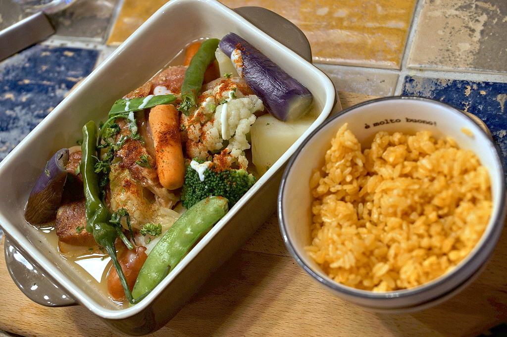 匈牙利鄉村紅酒燉牛肉 NT. 320,一樣附了薑黃飯,也使用了大量蔬菜點綴