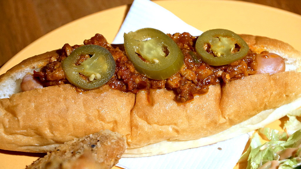 這份熱狗堡的上面淋了辣肉醬,還放了墨西哥辣椒片。猜測有加了Tabasco來製作,一口吃下去辣度非常高,連樂活團最會吃辣的團員都差點招架不住。幸好,辣的後勁不強,不會有辣到嘴巴腫起的狀態