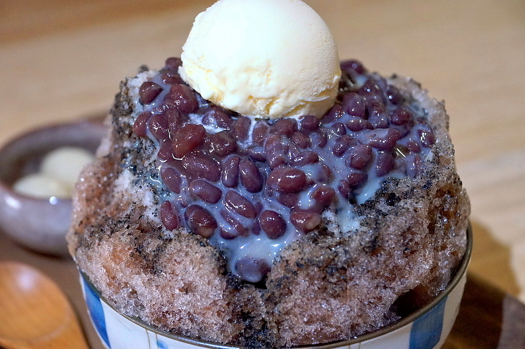 芝麻旋風冰淇淋刨冰 NT. 85,看上去是紅豆、煉乳以及冰淇淋的刨冰組合,頂上還放了一球香草冰淇淋