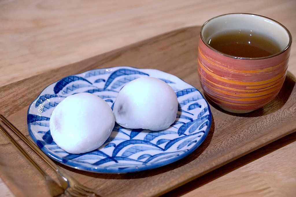 日式麻糬 NT. 50,由兩顆紅豆麻薯以及一杯麥茶組合的餐點