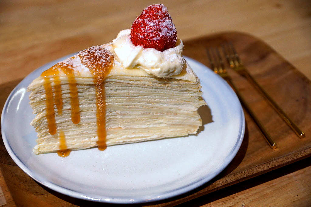 切開後的千層派,奶油與焦糖醬的味道相輔相成,一起入口非常合適